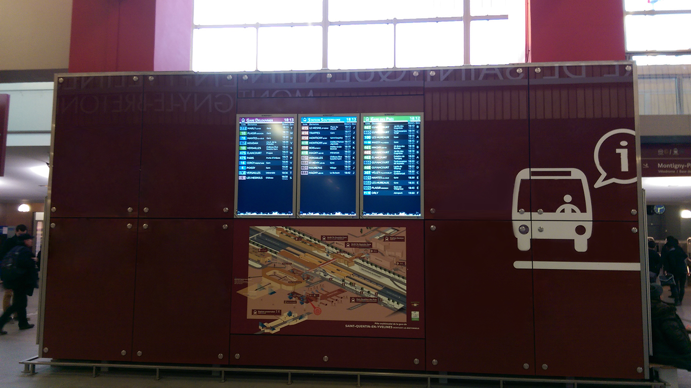 Afin d'équiper sa principale gare (2ème en Île de France avec 70 000 voyageurs / jour) d'un système d'information voyageur, Saint-Quentin-en-Yvelines a confié à la société Screensoft le développement de l'interface numérique ainsi que la fourniture, la pose des afficheurs et la maintenance. Nous ne pouvons qu'être satisfaits de la prestation et notamment de la compétence et de la disponibilité de l'équipe Screensoft qui a réalisé cette opération dans le respect des délais.