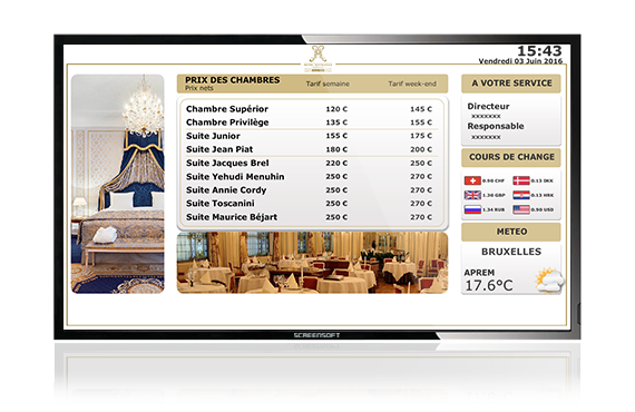 L’Hôtel Métropole profite aujourd’hui de la version Hôtellerie de notre logiciel et exploite au maximum notre système de réservation de salles et de signalétique digitale. Sont ainsi diffusées les différentes réunions et manifestations de la journée ainsi que les orientations à emprunter pour accéder aux différents salons, bars et restaurants.